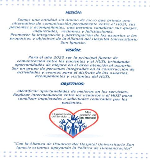 Somos una entidad sin ánimo de lucro que brinda una alternativa de comunicación permanente entre el Hospital Universitario San Ignacio (HUSI), pacientes y acompañantes. En la Alianza de Usuarios participamos voluntariamente pacientes que somos atendidos en diferentes especialidades. Nuestro principal propósito, es la divulgación de los derechos y los deberes de los usuarios, quienes tienen la posibilidad de conocer acerca de nuestro rol como pacientes. Este año venimos motivados y con muchas ideas para realizar en nuestro Hospital.